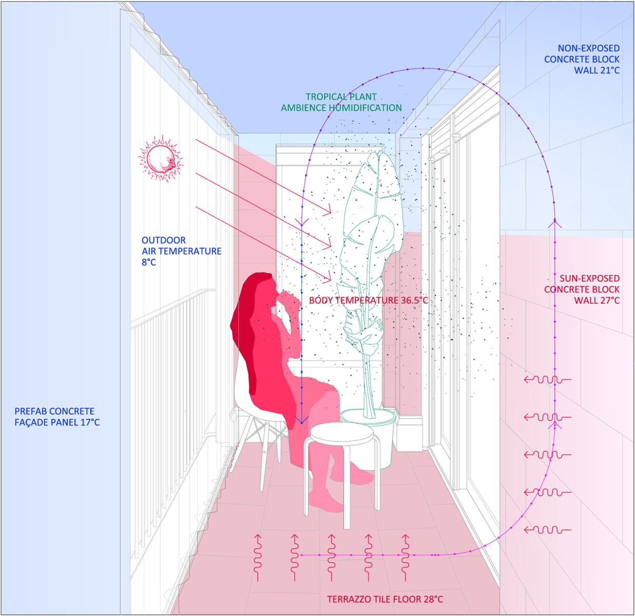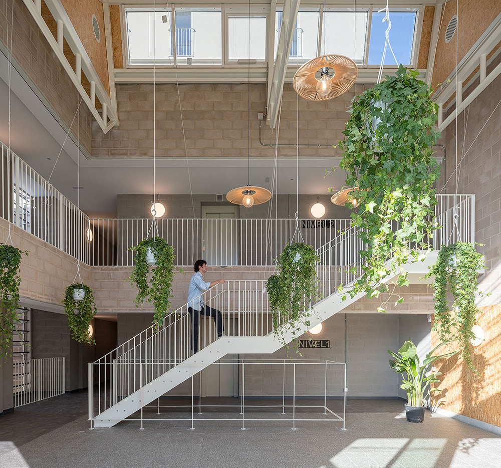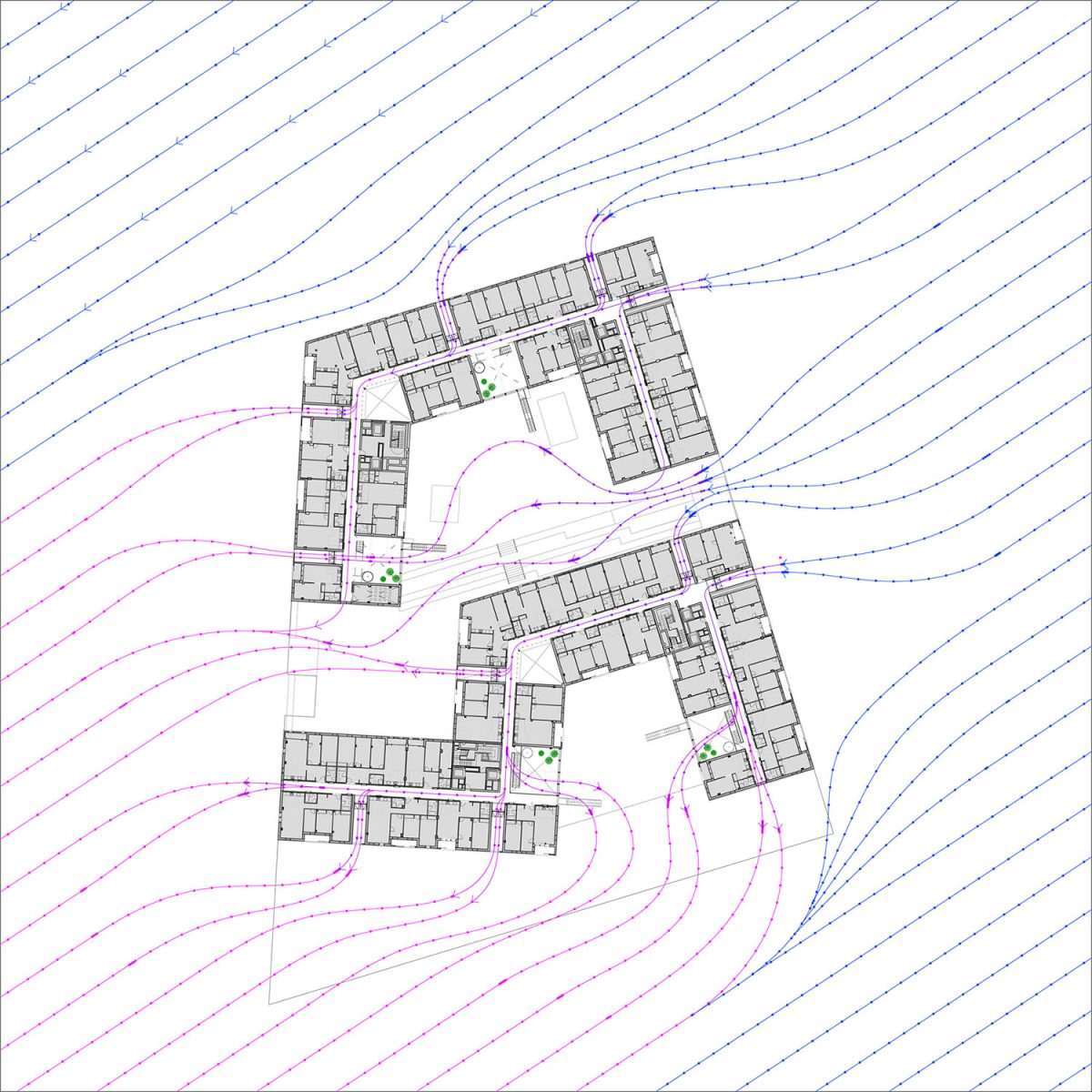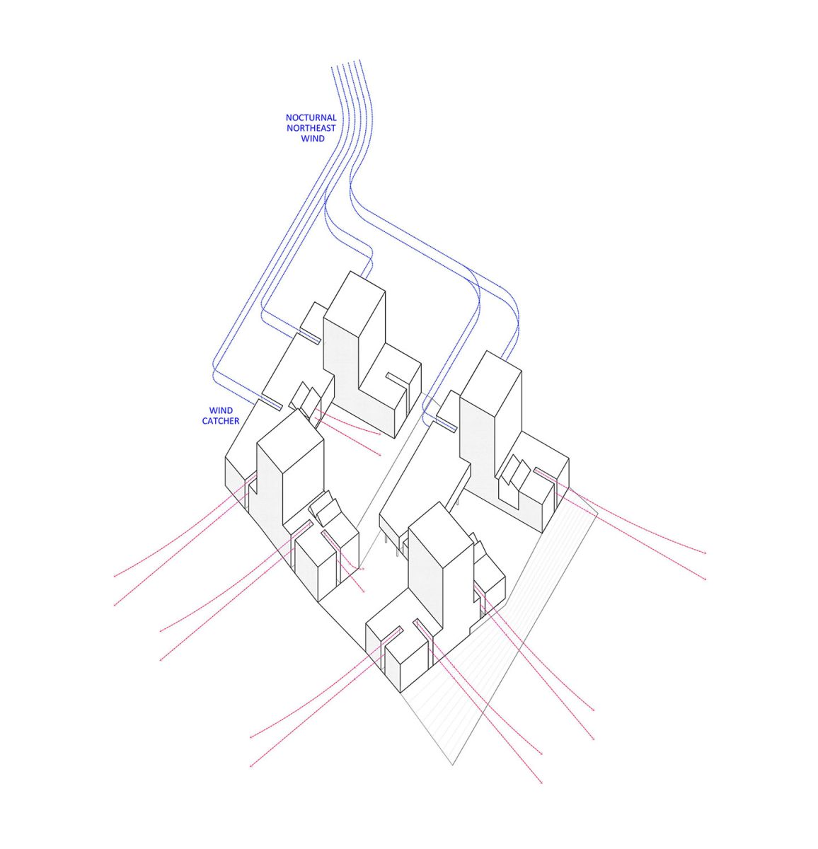 Sobre este basamento se colocan cuatro torres de seis alturas que rematan el edificio y lo anclan a la ciudad. La conformación del edificio mediante un basamento continuo de tres alturas hace que su presencia en el barrio no sea invasiva, con un bloque de baja altura que no impide ni las vistas ni el soleamiento a las calles y los edificios circundantes. La estrategia formal y material busca aprovechar la ubicación del solar para contrarrestar el efecto isla de calor urbano y lograr una buena orientación solar para los meses de invierno, a la vez que ofrece accesos desde la calle y una continuidad con la trama urbana circundante.