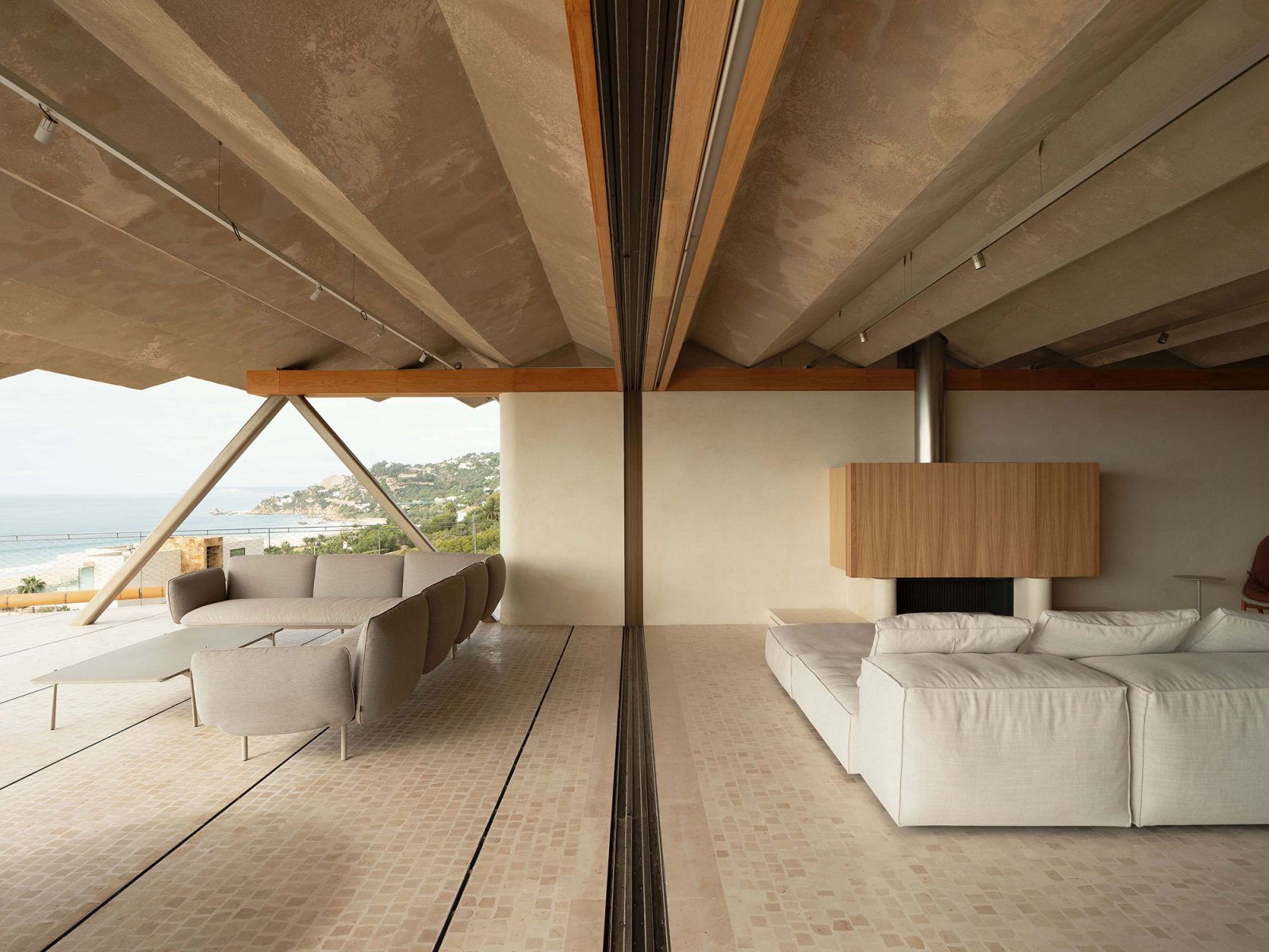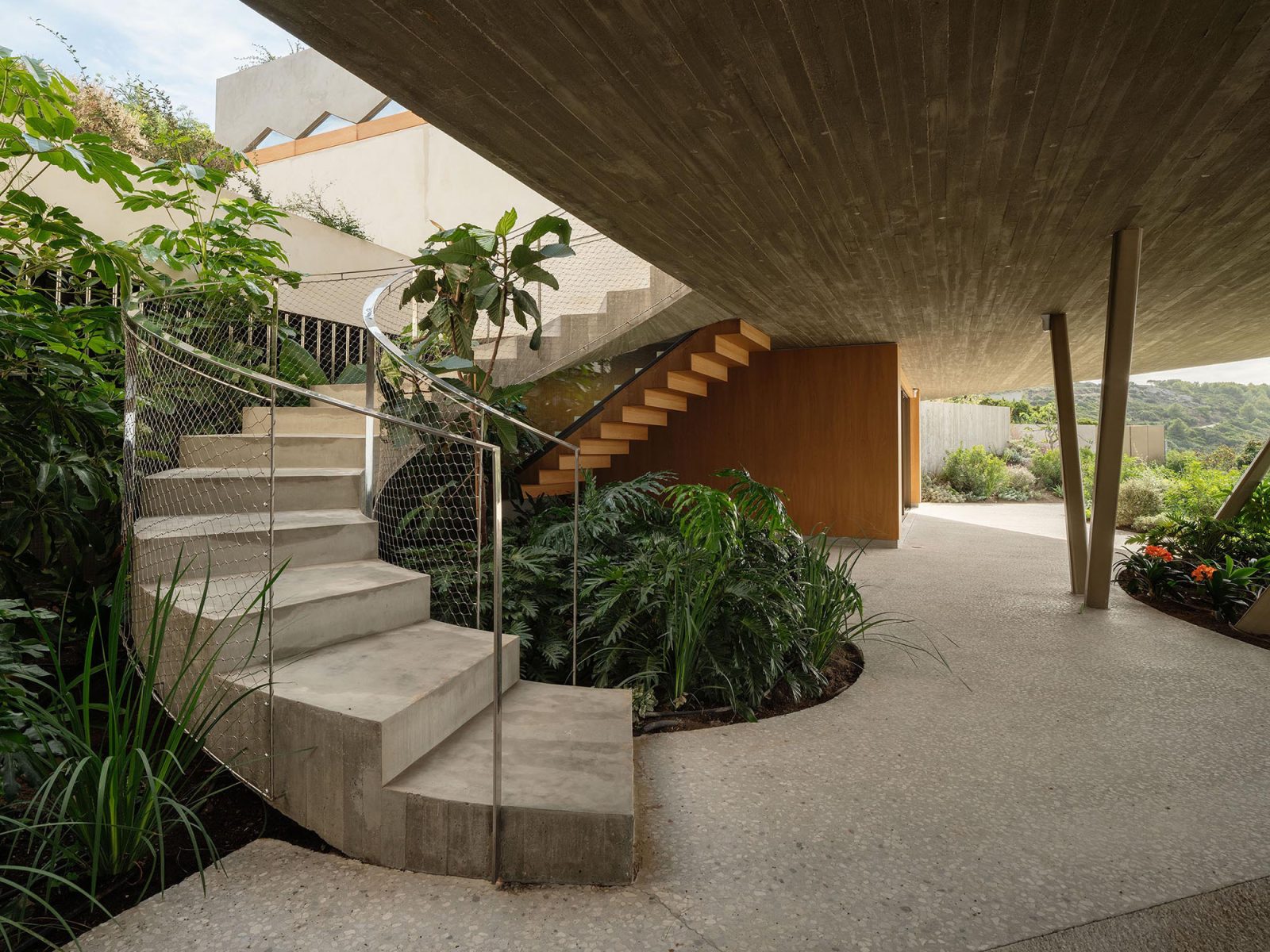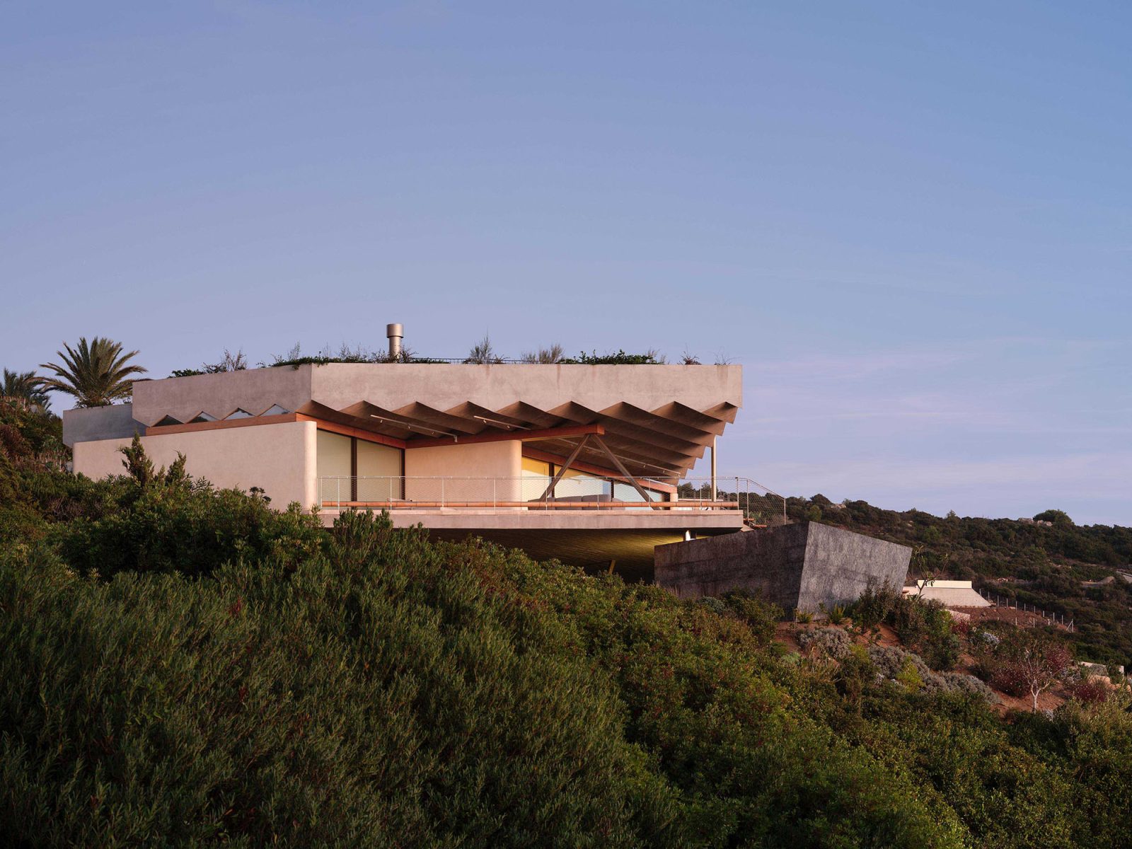 Los muros paralelos organizan la planta de la vivienda y gestionan los vientos cambiantes. El volumen principal de la vivienda se eleva incrustándose en el terreno y se asoma al mar, con una cascada de gradas y escaleras que permiten el acceso a la piscina y al terreno. La materialidad dificulta la visión de la casa desde el mar, mimetizándose con los colores del entorno natural. La vegetación autóctona se planta para reconstruir el cuerpo vegetal y reducir la carga térmica de la vivienda.