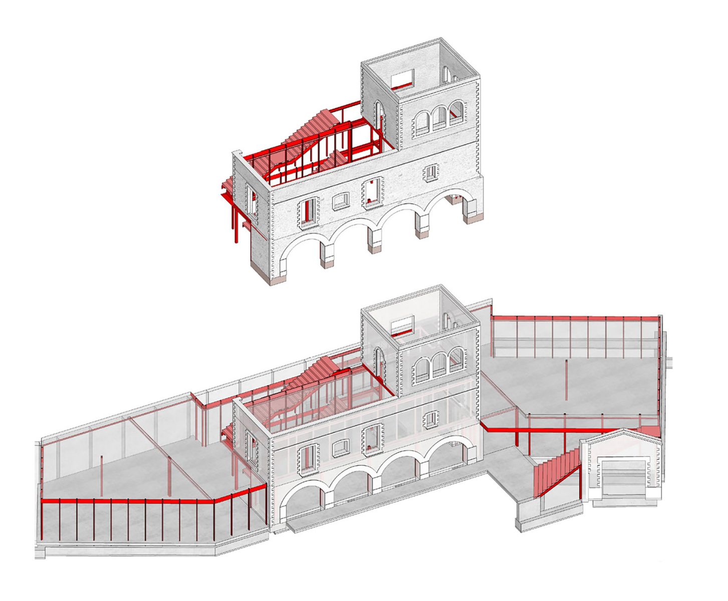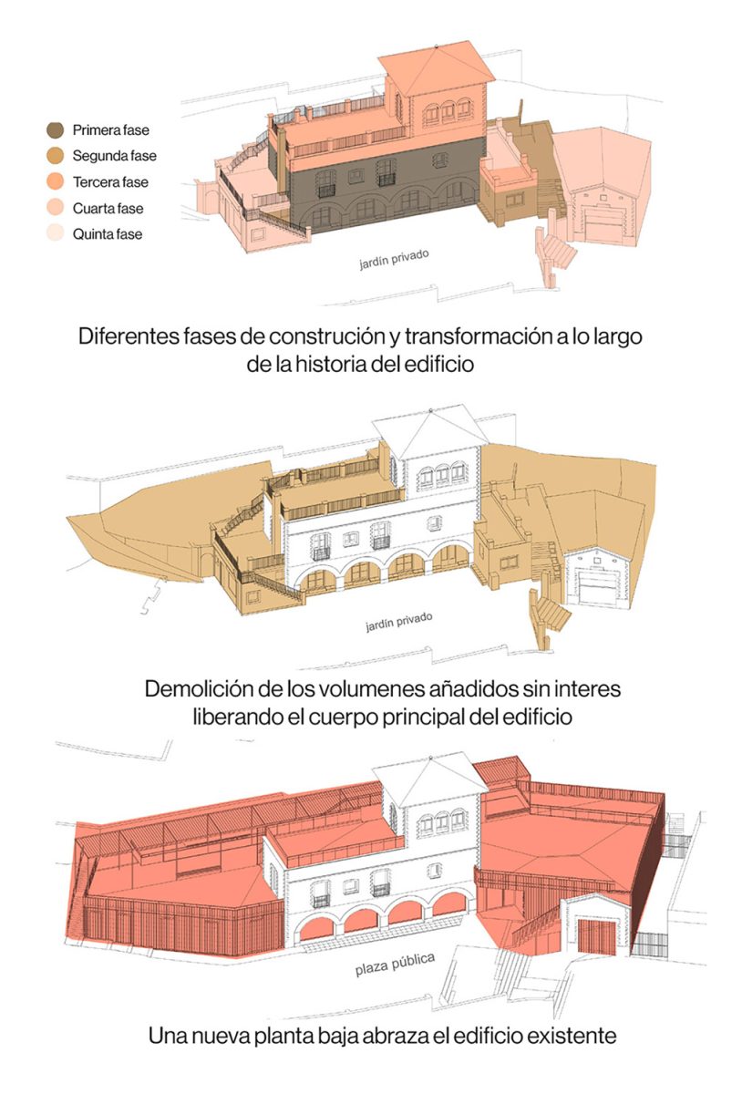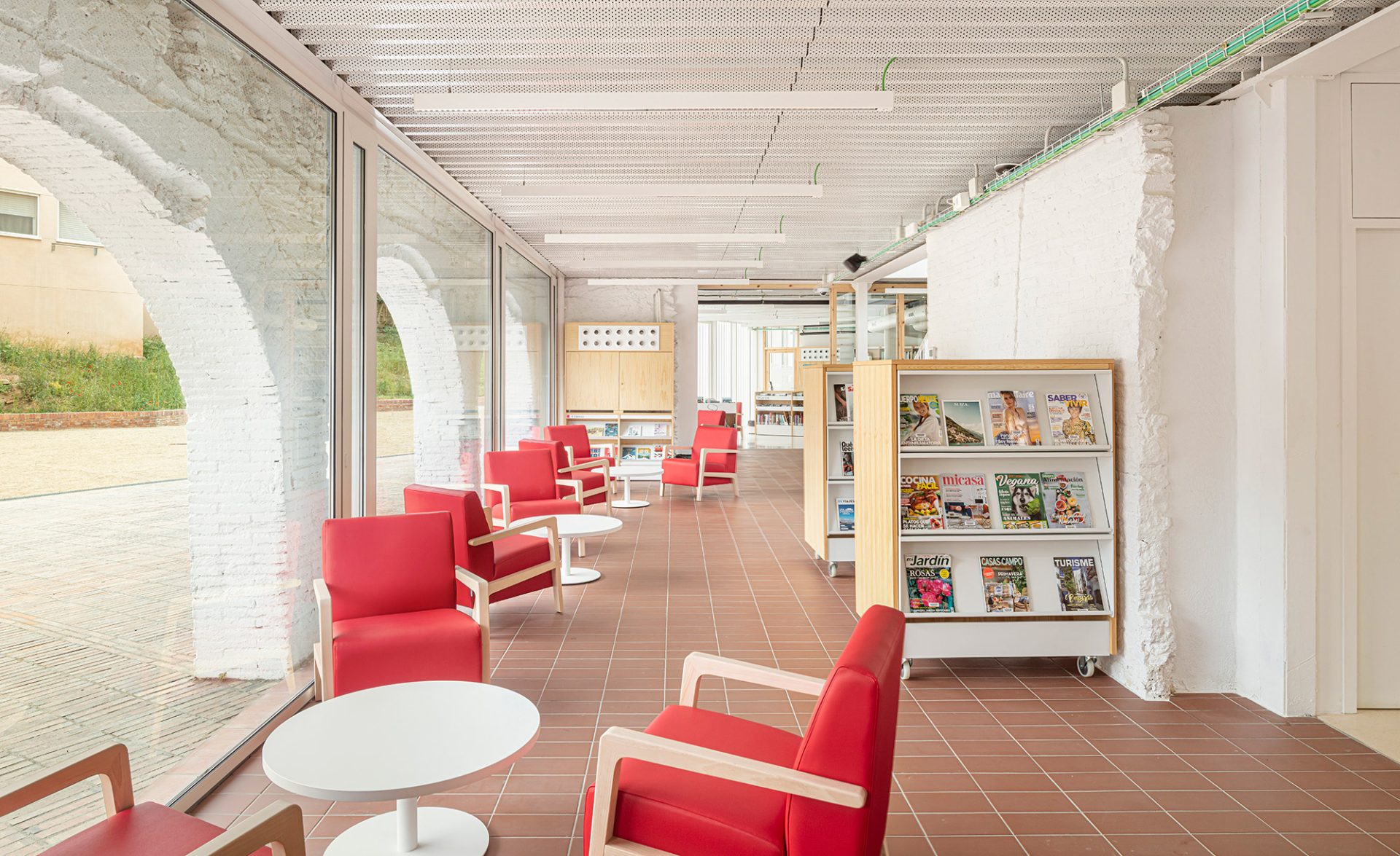 En la fachada, donde reaparecen las texturas de las técnicas constructivas utilizadas en las diferentes fases y ampliaciones, se lleva a cabo un tratamiento de pintura homogéneo que da unidad al conjunto e integra todos los elementos constructivos y decorativos originales: molduras, cornisas, esquineras y barandillas. La planta baja del edificio original se destina a espacio de acogida y promociones, y a su alrededor se construyen los espacios necesarios para el programa funcional de una pequeña biblioteca, con luz natural gracias a un patio junto a la medianera posterior y a la fachada acristalada.