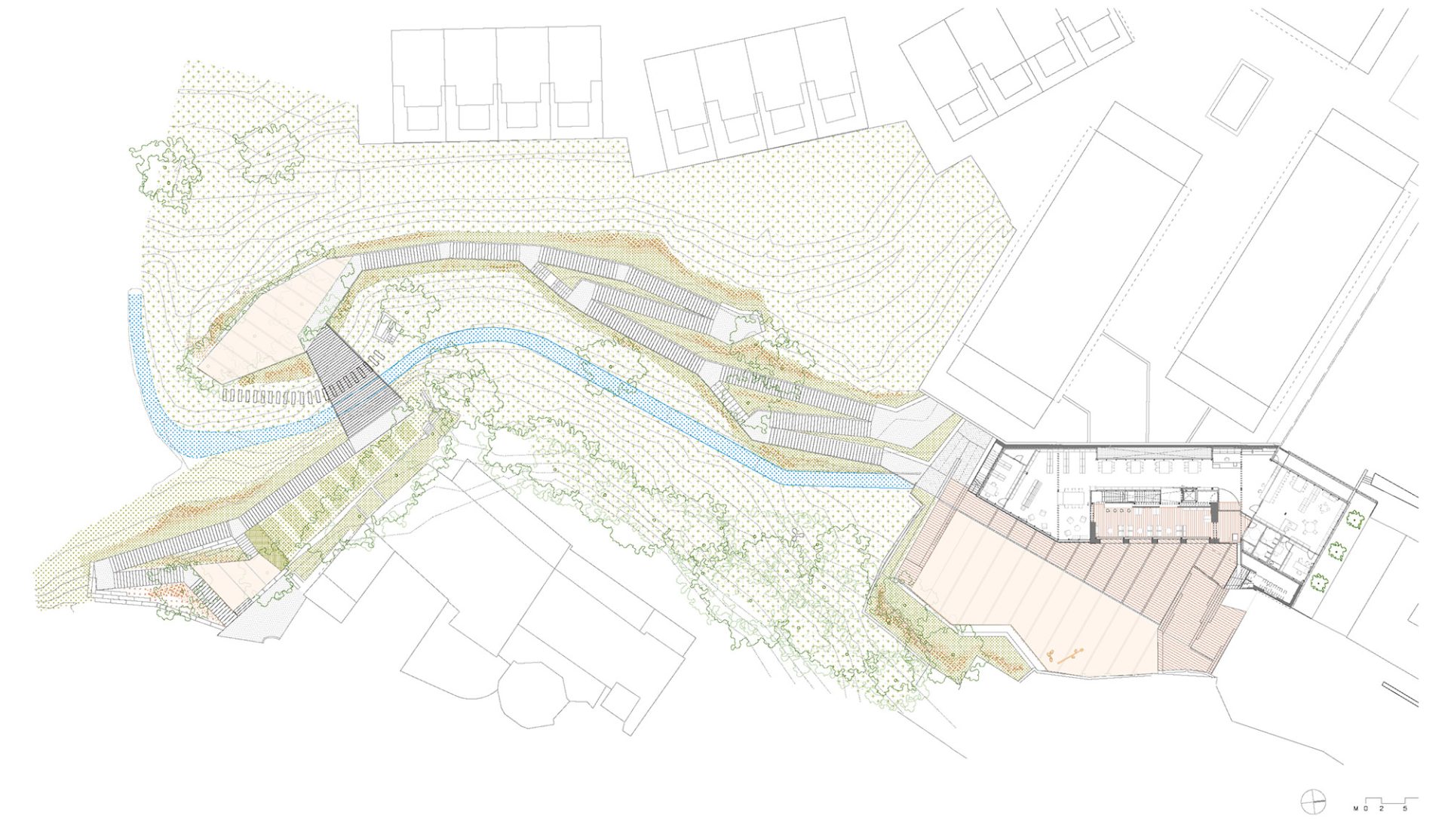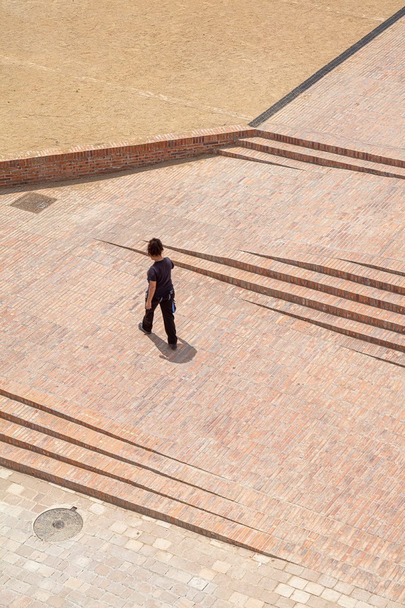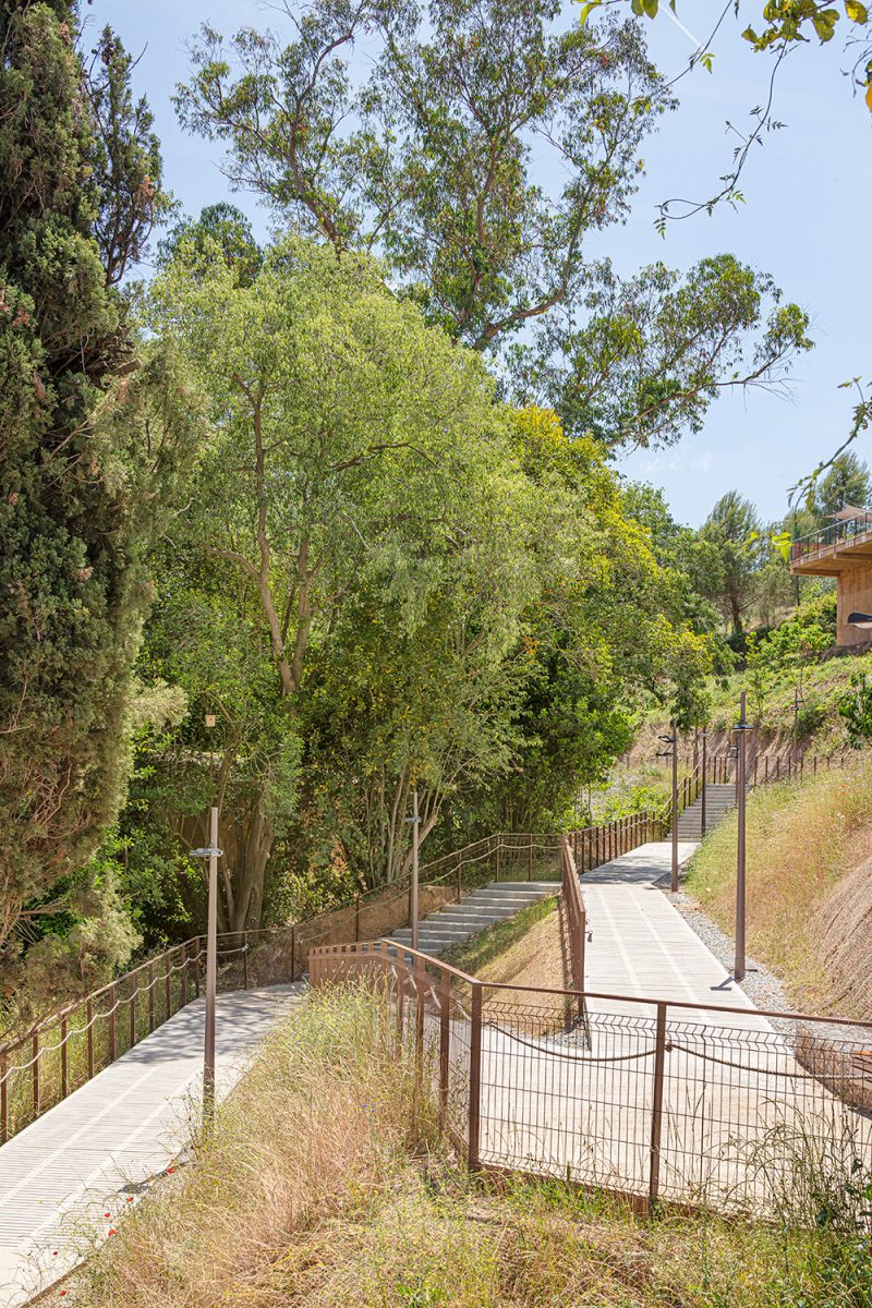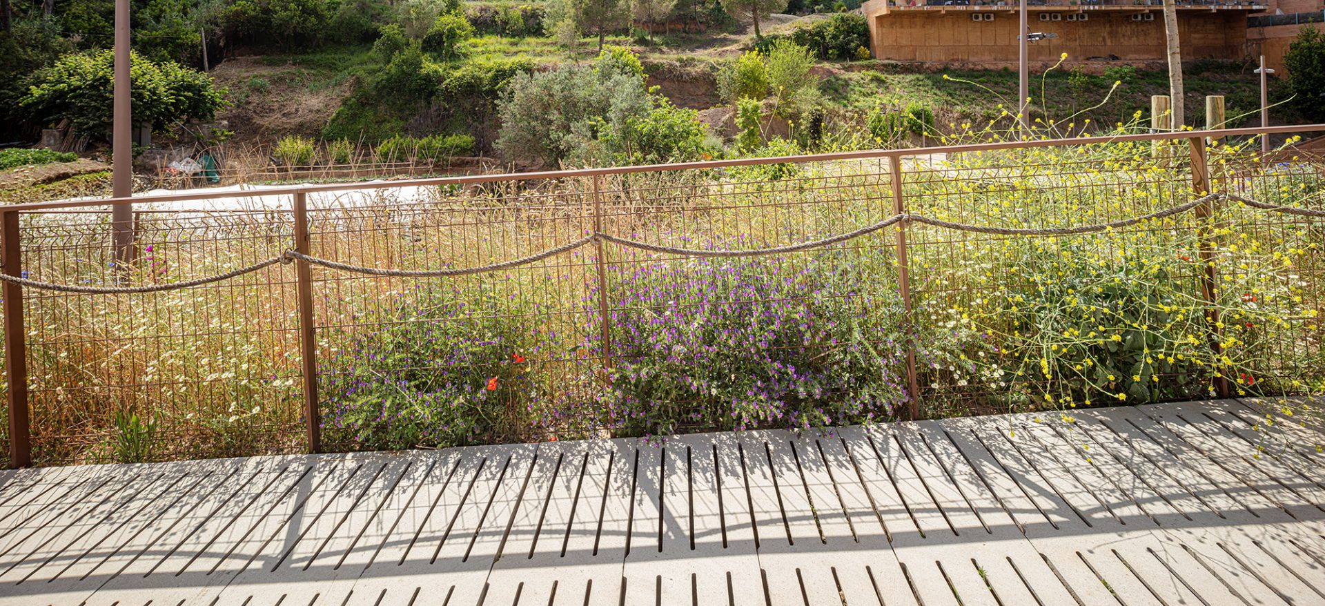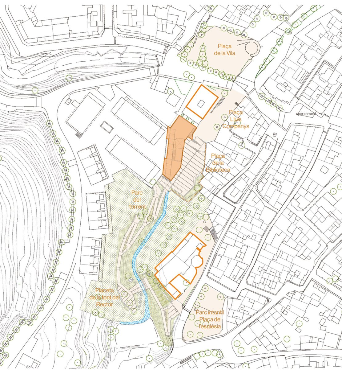 La nueva plaza pública, donde antes había un jardín privado, forma parte de un itinerario que se abre paso hacia los jardines de la Font del Rector, un espacio natural revegetado con especies autóctonas que se implanta siguiendo las curvas de nivel y conectando las dos orillas del torrente con una nueva plataforma.