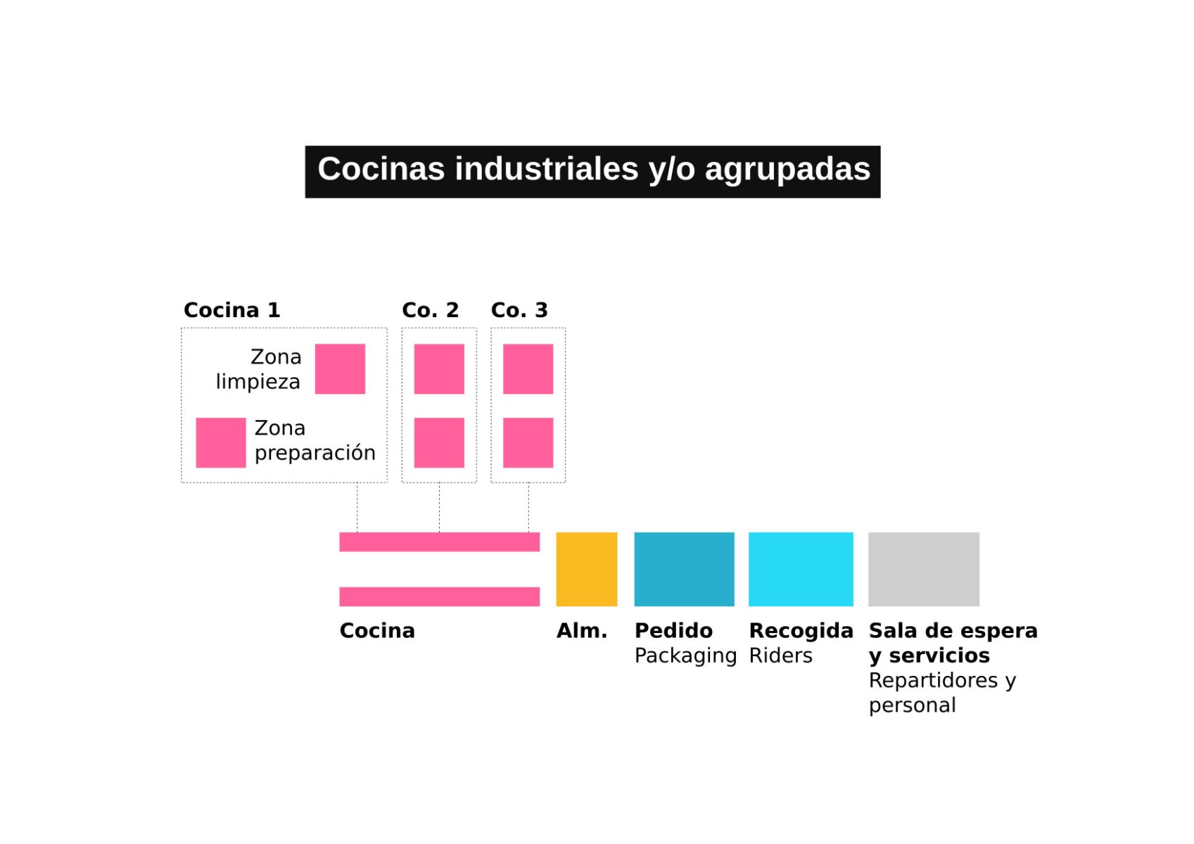 Se han generado modelos híbridos entre el plano físico y el digital que conviven con fórmulas ya establecidas como los espacios de preparación de platos preparados, las empresas de catering o las cocinas industriales centrales de cadenas de restaurantes con otras actividades fruto de la economía de plataformas, como las cocinas o los supermercados fantasma).