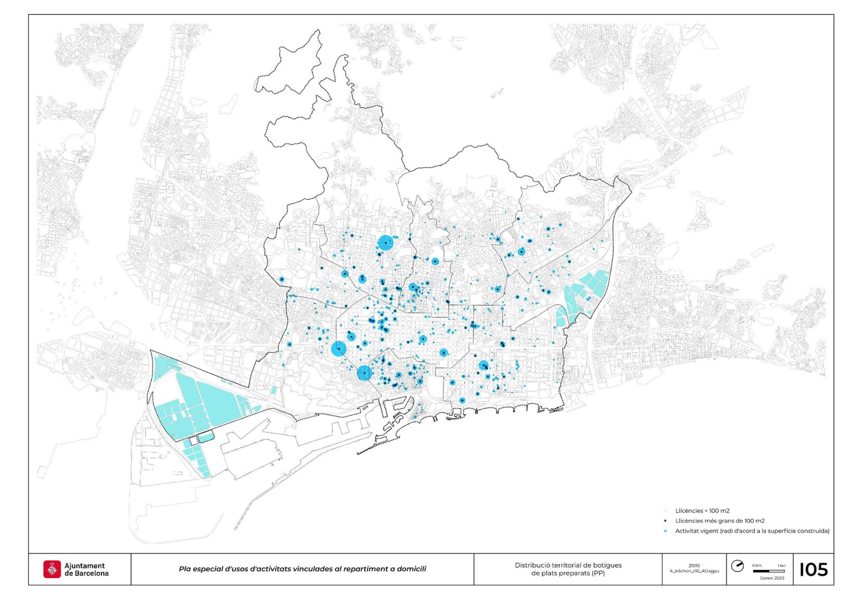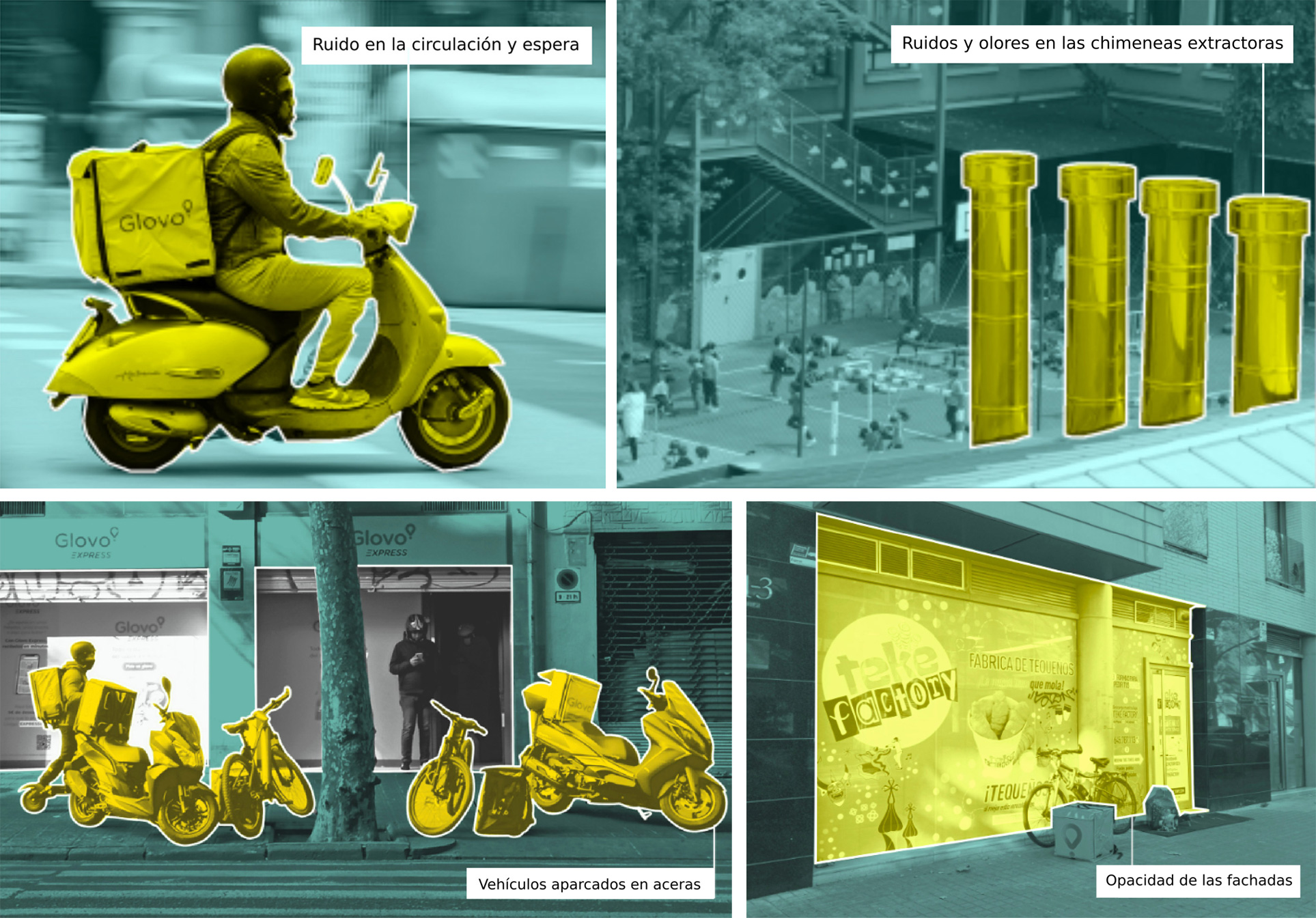 Estas tipologías de establecimientos llevan asociadas molestias ambientales (humos, olores o ruidos producidos por la elaboración intensiva de comida en grandes cantidades) e impactos en el espacio público por el trasiego de la carga y descarga de mercancías o la acumulación de vehículos y repartidores en un mismo tramo de calle.