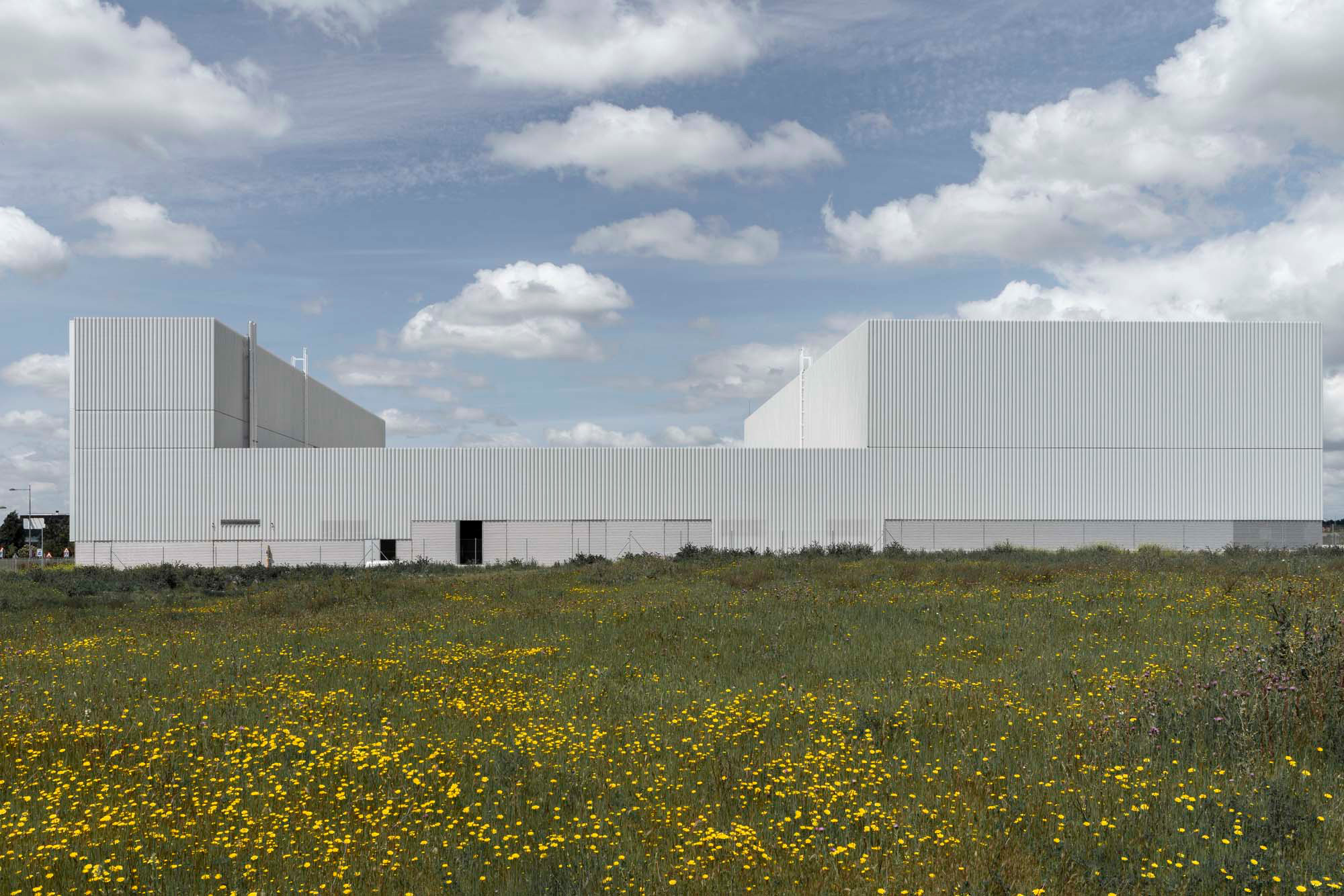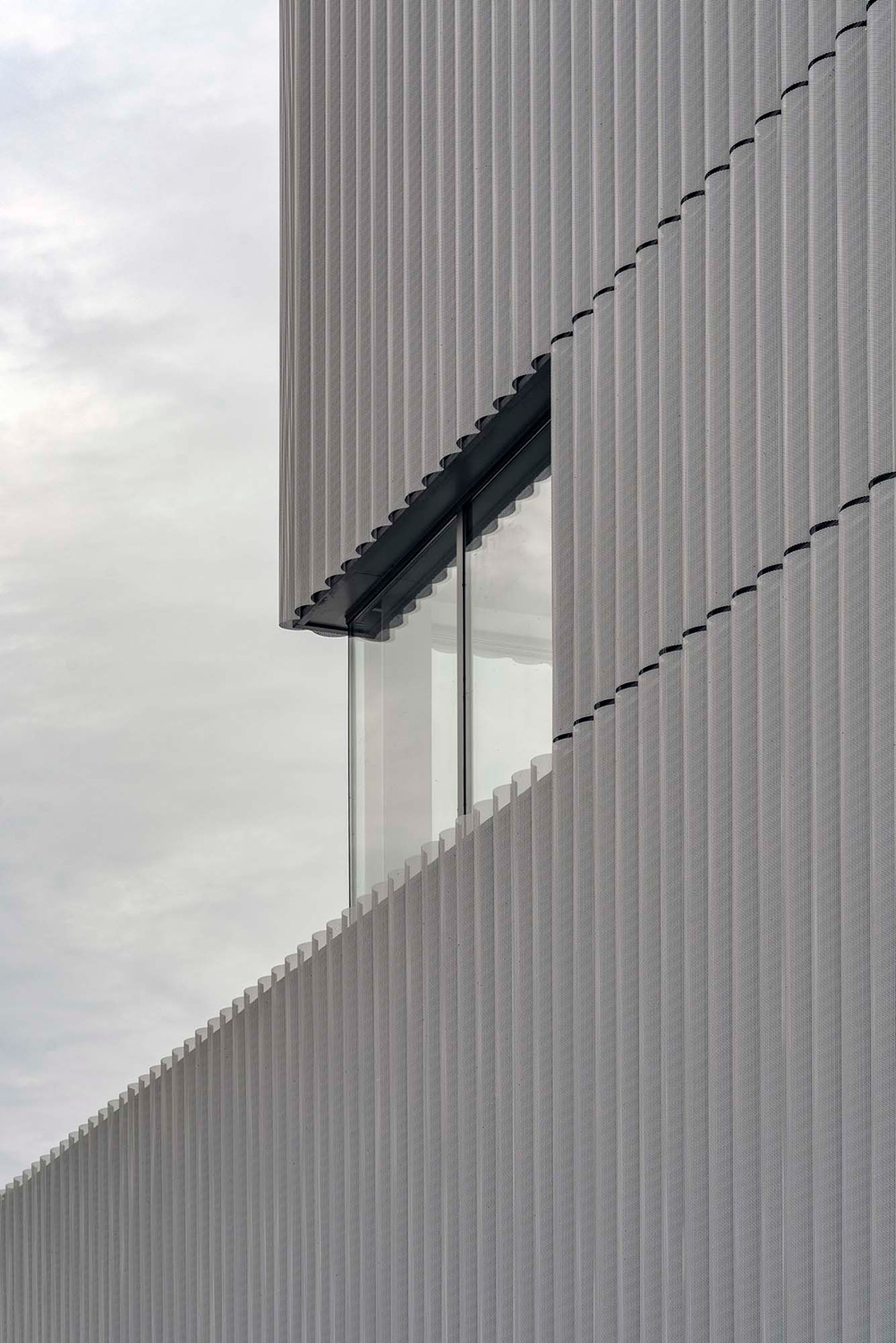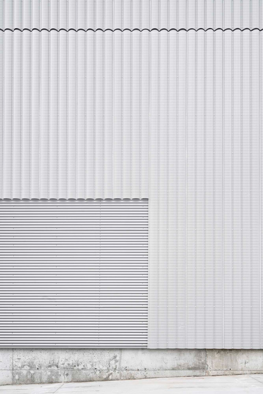 El edificio tiene un programa mixto que incluye la sede central de la empresa, los laboratorios y el área de acondicionado y una zona logística. El proyecto sigue esta misma lógica y se desarrolla a partir de la adición de volúmenes simples que responden a requerimientos básicos de superficie y altura libre. Así, la organización en bandas sucesivas – oficinas, laboratorios, acondicionado y logística- se manifiesta al exterior mediante el cambio de altura de cornisa de 7,50 m a 15,00 m. Adicionalmente, el cuerpo delantero, de 15,00 m de altura total, se ordena para acoger 3 plantas de oficinas.