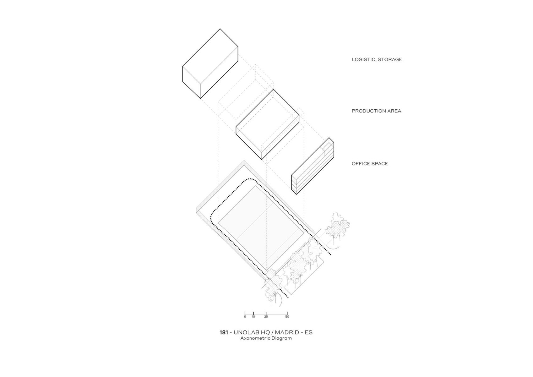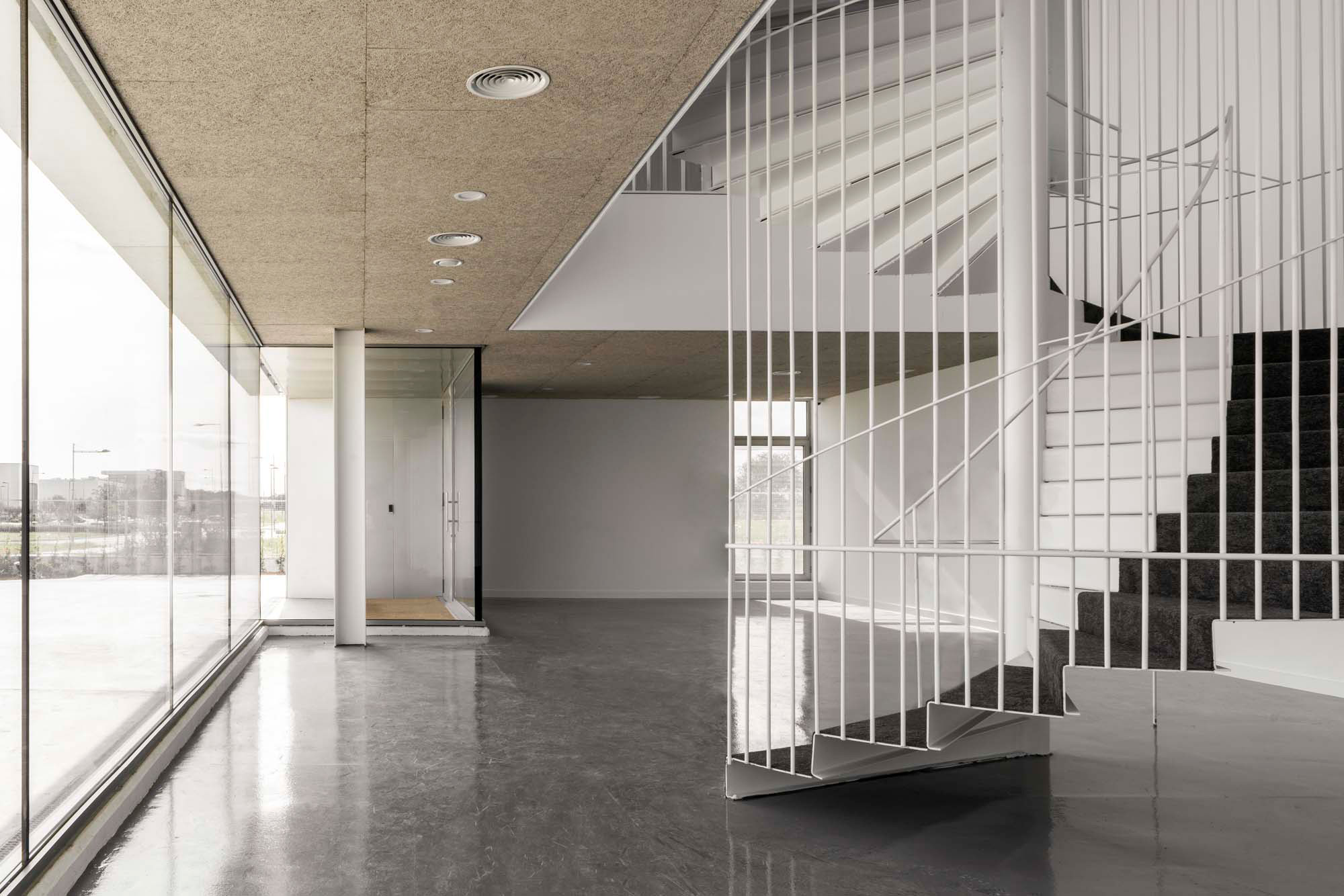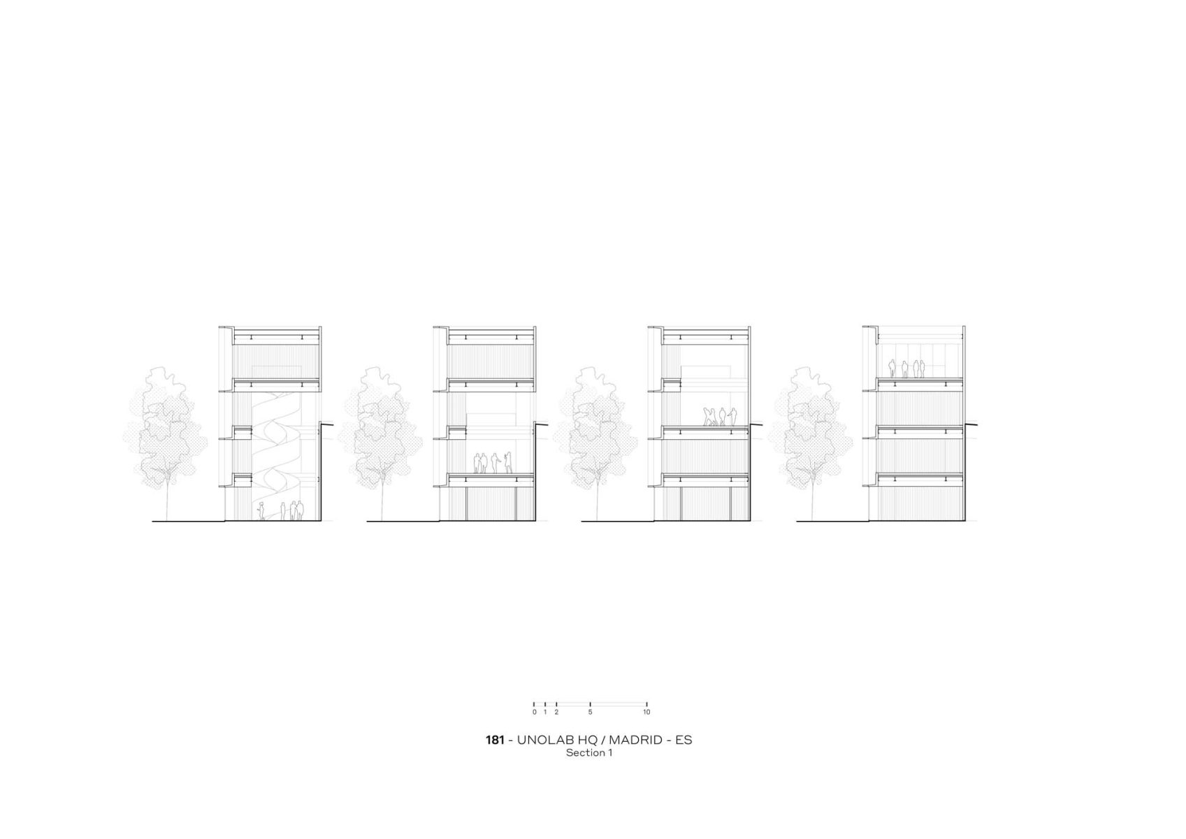 La necesaria representatividad del edificio como sede de UNOLAB se consigue mediante una serie de operaciones básicas de vaciado la pieza que construye la fachada principal, y que proporciona una secuencia de espacios diagonales que abarcan diferentes alturas, y que alojan los espacios de recepción, reuniones y acceso. En el vestíbulo, un gran hueco aloja una escalera helicoidal que conecta todas las plantas