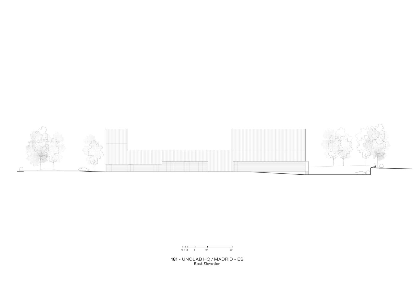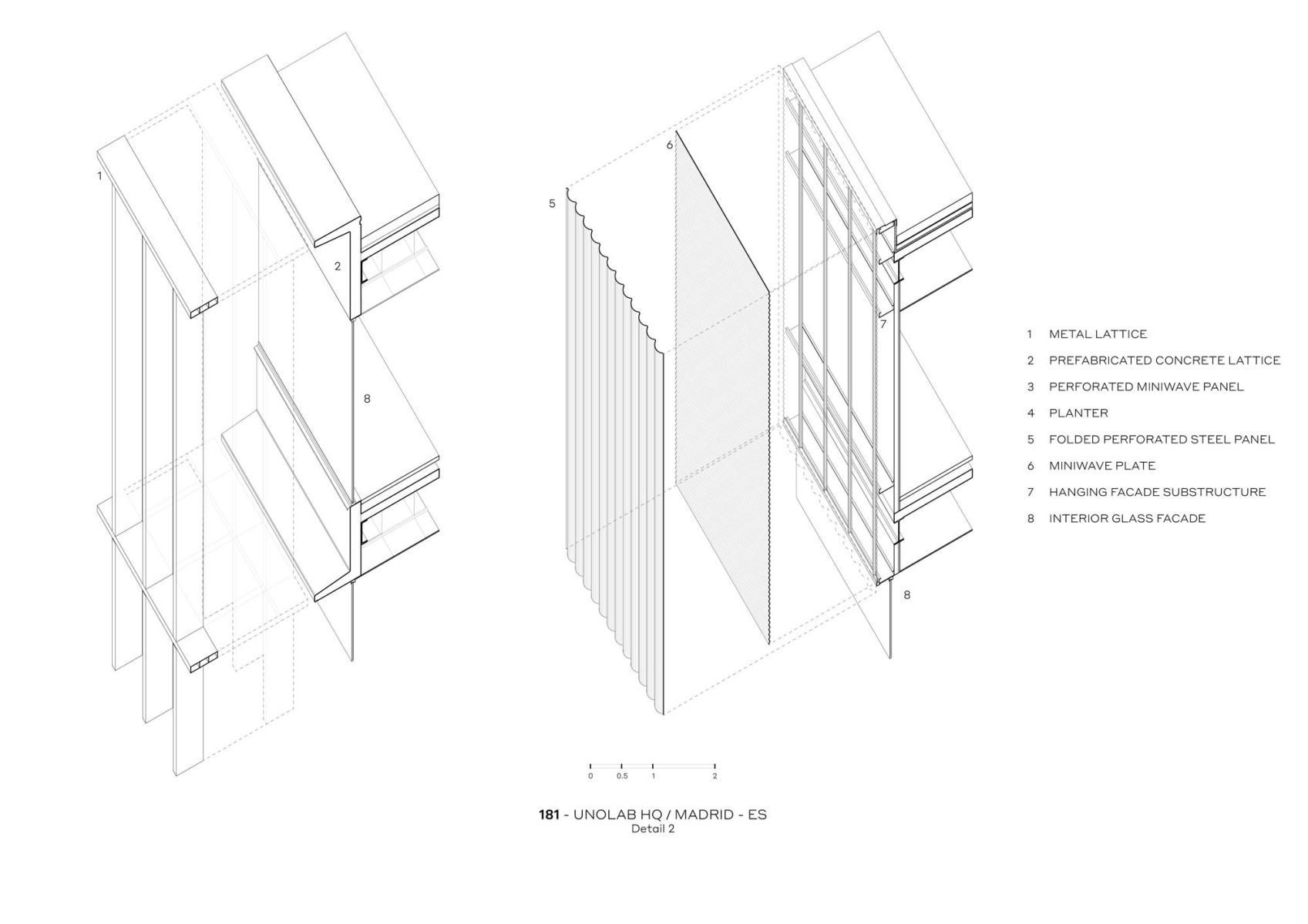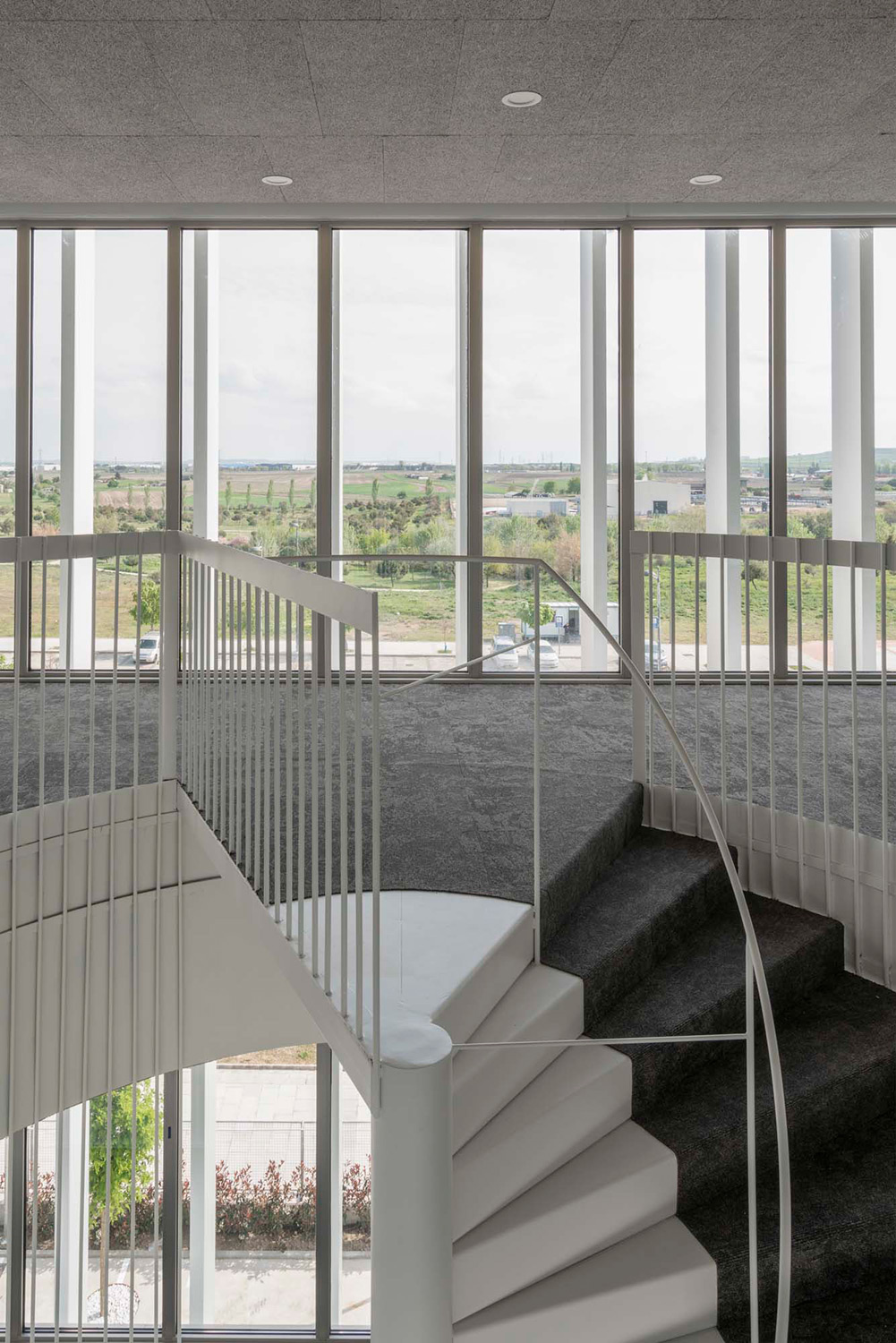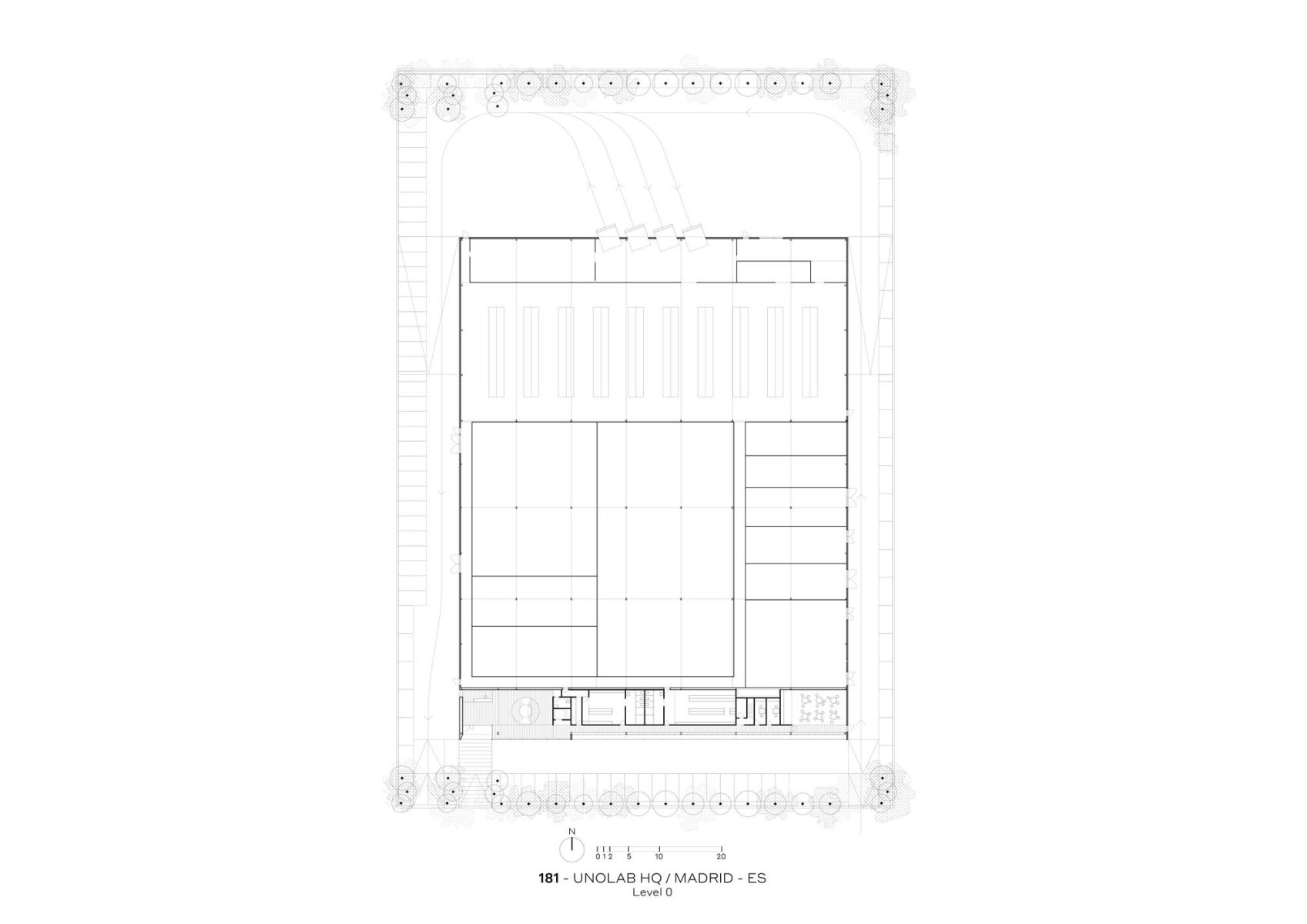 La necesaria representatividad del edificio como sede de UNOLAB se consigue mediante una serie de operaciones básicas de vaciado la pieza que construye la fachada principal, y que proporciona una secuencia de espacios diagonales que abarcan diferentes alturas, y que alojan los espacios de recepción, reuniones y acceso. En el vestíbulo, un gran hueco aloja una escalera helicoidal que conecta todas las plantas