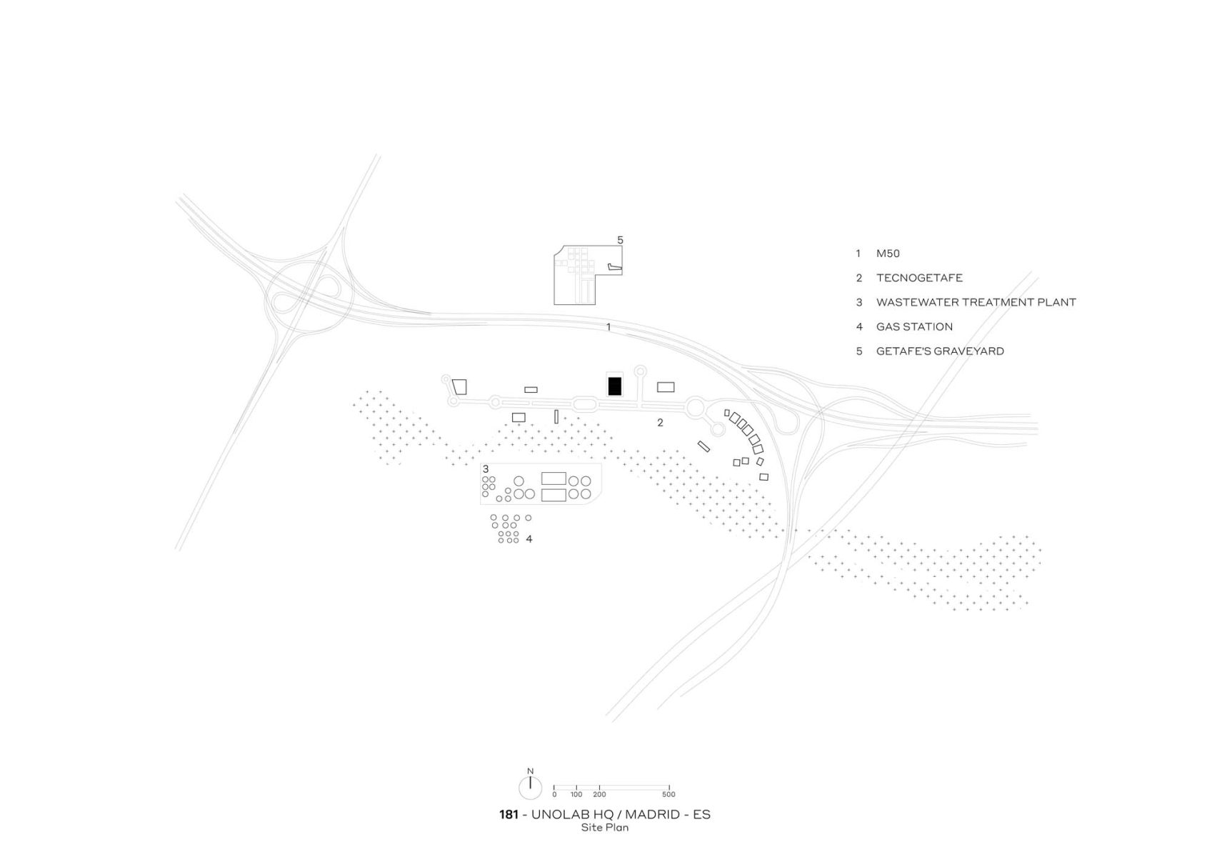 El proyecto para la sede central de una farmacéutica en el sur de Madrid se sitúa en uno de los grandes Parques Tecnológicos -antes llamados Polígonos Industriales- que jalonan un territorio disperso, caracterizado por las grandes infraestructuras que lo recorren. Entre la autopista orbital M50 y el parque lineal del Arroyo Culebro, Tecnogetafe se erige como un incipiente cluster tecnológico cuyos edificios son visibles desde el importante nudo que une la M50 con la autopista R4 al este.